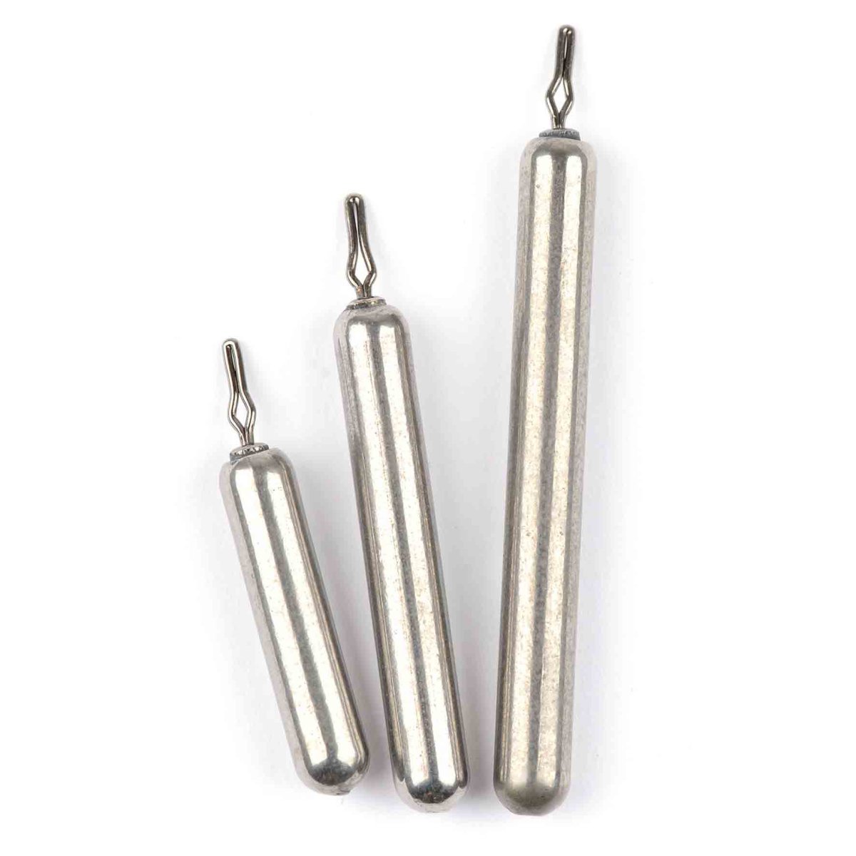 Stavformade tungstensänke till dropshotfiske. Tungsten har högre densitet än bly och är ett miljövänligare alternativ.