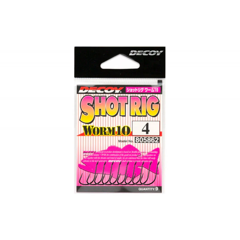 Decoy Shot Rig Worm10 Hooks är ultravassa enkelkrokar som är perfekta för olika finess-presentationer och är av hög, japansk kvalitet. Konstruerad med ett unikt uppsvängt öga som håller jiggen i ett upprätt läge för bästa presentation och krokningsförmåga när du fiskar med drop shot eller split shot rig.