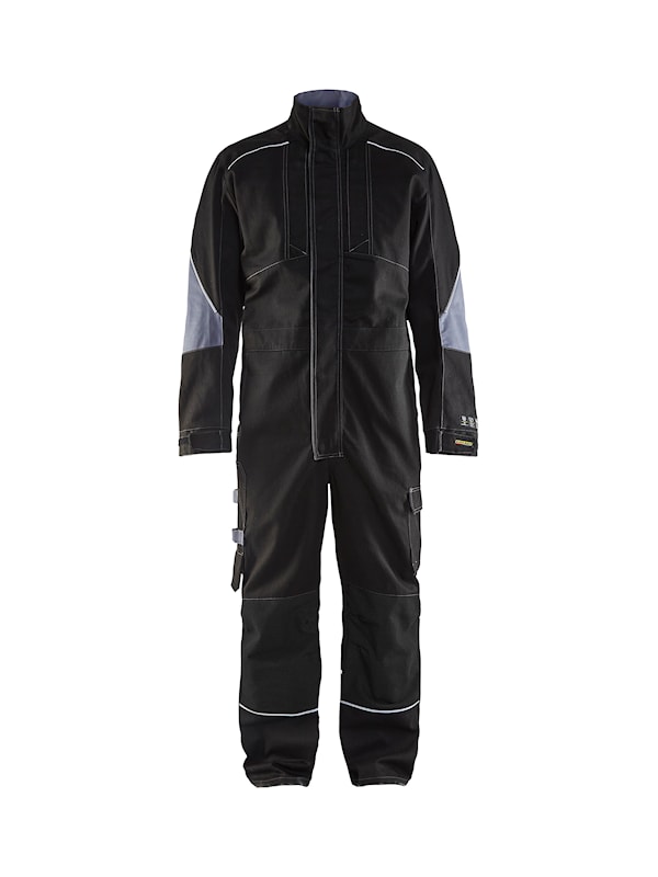 Olje-, smuts- och vattenavvisande flamoverall i slitstarkt material som har praktiska fickor samt dolt kraftigt tvåvägsblixtlås i metall. Bälg i rygg och förböjda ärmar för bra komfort. Reflexdetaljer som ger ökad synlighet. Tål industritvätt.