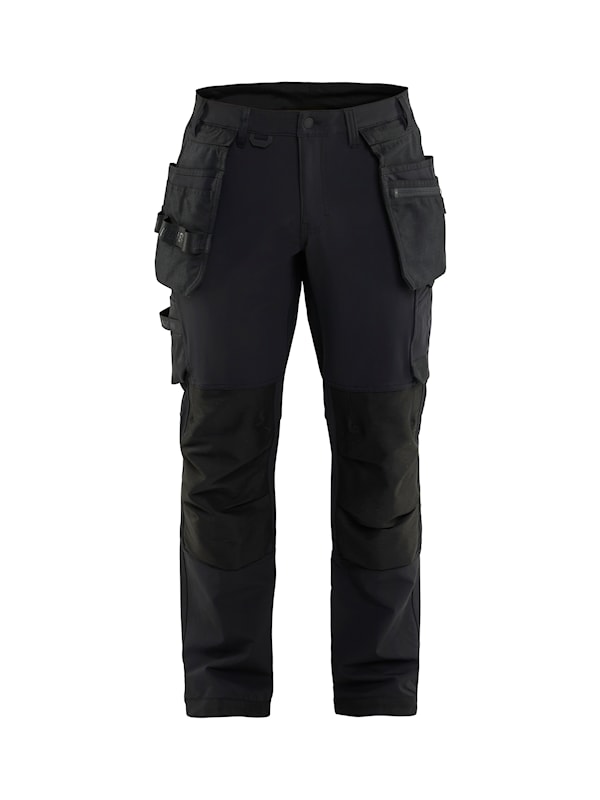 Har knäskyddsficka med CORDURA®-stretch med öppning nedtill, löstagbara hängfickor, bakfickor med bälg, tumstocksficka samt loop för hammarhållare på både vänster och höger sida.