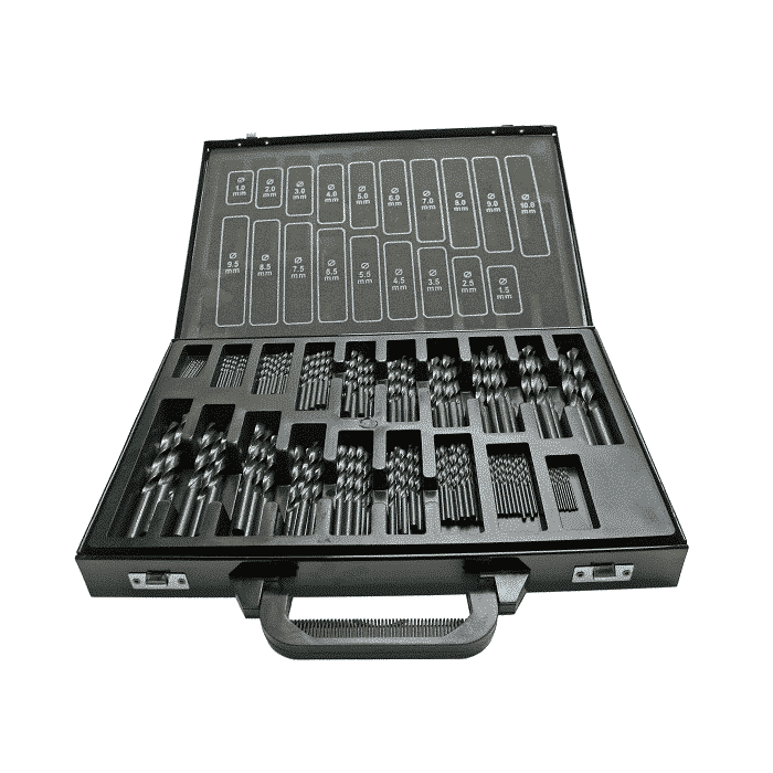 Komplett borrlåda med billig så kallad ”slit och slängborr” HSS-R high valsade. 170st borr 1-10mm. 0,5 mm stg. 10st 1-8mm, 5st 8,5-10mm.
