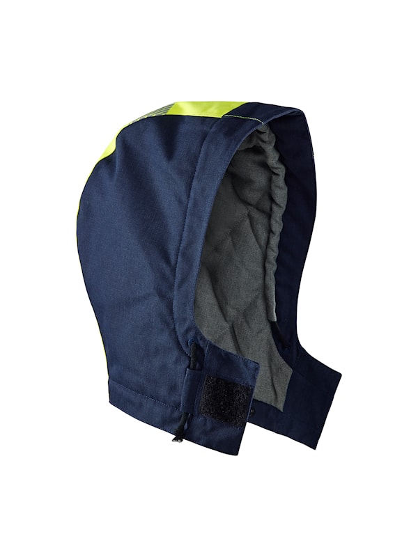 Flamskyddad, hjälmanpassad och varmfodrad vinterhuva med reflexdetaljer. Har multipla inställningsmöjligheter och fästs med plasttryckknappar.