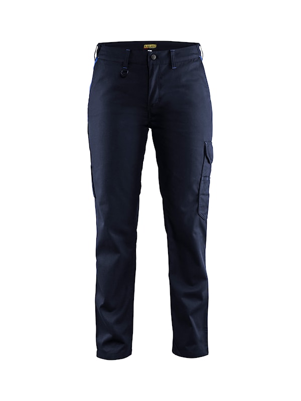 Industri- och servicebyxa anpassad för kvinnor. Byxan har resår i midjan, avsmalnande ben och flera smarta ficklösningar, såsom bakficka med lock, benficka med telefonficka, tumstocksficka, ID-kortsficka och pennfickor.