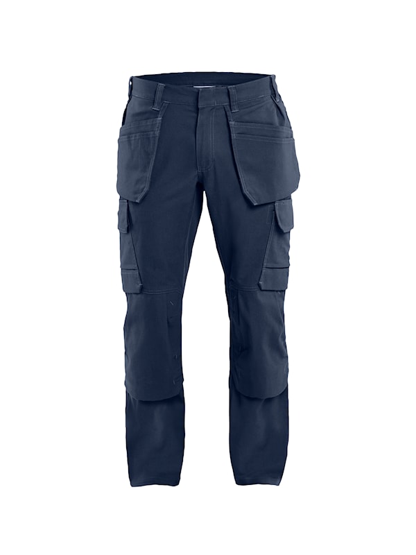 Byxan är godkänd för industritvätt, så den tål vardagens hårda rutiner – om och om igen. Förböjda ben ger smidig rörelse, knäskyddsficka avlastar vid knäarbete och fasta verktygsfickor håller ordning. Resår i midjan främjar komforten. En reflexdetalj på benen adderar synbarhet när ljuset faller.