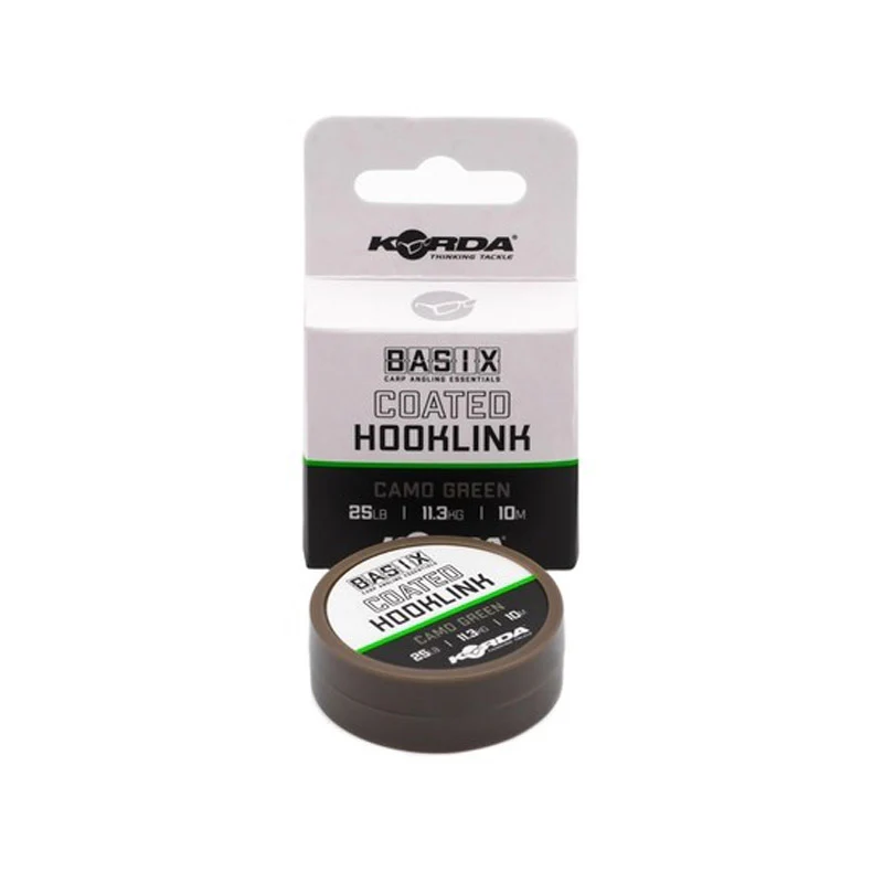 Korda BASIX Coated Hooklink är ett mjukt och följsamt coated braid-material som lämpar sig för en mängd olika presentationer med bottenbeten, wafters och pop-ups. Både den inre flätan och den yttre coatingen har en diskret ”camo green”-färg för att säkerställa att den smälter in oavsett vilken typ av botten du fiskar över. Den lägger sig rakt utan behov av ångning och har mycket goda anti-trasselegenskaper. Coatingen kan dessutom enkelt skalas av där det behövs för att skapa en hinge och ge riggen extra rörelse.