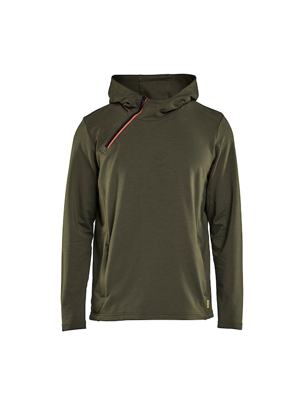 Luvtröja i stretchig french terry i modernt utförande med sneddad half zip. Tillverkad i ett mjukt, svalt och följsamt material – perfekt för dagar i rörelse. Den kroppsnära passformen ger en modern silhuett, medan ventilationshål under ärmarna hjälper till att reglera temperaturen. Förvaring ordnas enkelt med två blixtlåsfickor. En tröja som följer med – oavsett riktning.