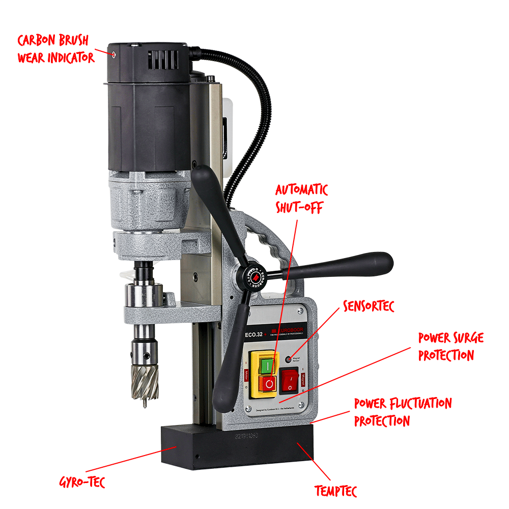 Den kompakta Euroboor ECO.32+ magnetkärnborrmaskinen har en kraftfull enkelhastighetsmotor på 1 000 W. Denna portabla magnetiska kärnborrmaskin drar nytta av innovativ elektronik som erbjuder mer säkerhet, avsevärt minskar risken för skador på maskinen, verktyget och arbetsstycket och skyddar användaren vid överdrivna vibrationer eller plötslig förskjutning. Livslängden är betydligt längre och du slipper höga underhållskostnader. Denna lätta och pålitliga maskin är ett riktigt tillskott för varje arbetsplats.