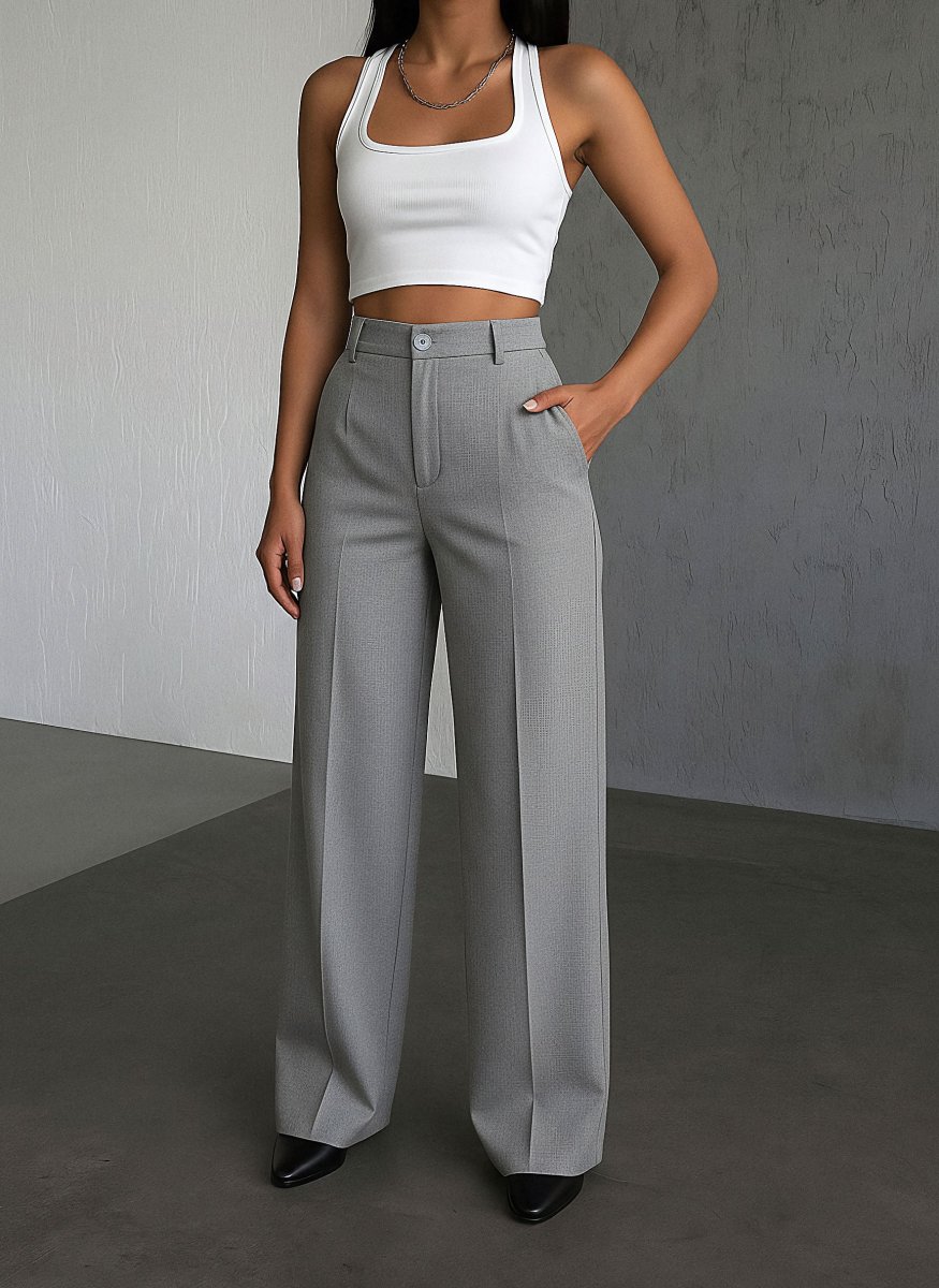 Stilrena grå palazzo-byxor med hög midja och vida ben som ger ett elegant och tidlöst uttryck. Det mjuka, följsamma materialet sitter bekvämt och ger ett fint fall längs benen. En mångsidig modell som passar lika bra till vardag som till mer uppklädda tillfällen.