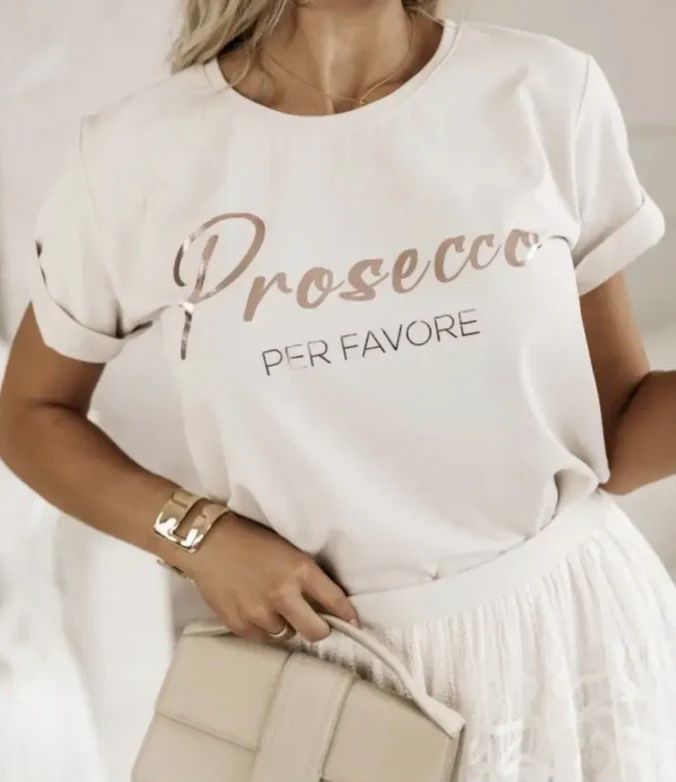 Kortärmad Beige t-shirt med stilrent “Prosecco” tryck framtill. Tillverkad i Italien i en mjuk och följsam kvalitet som ger en bekväm passform. Perfekt att styla till både vardag och mer uppklädda looks.