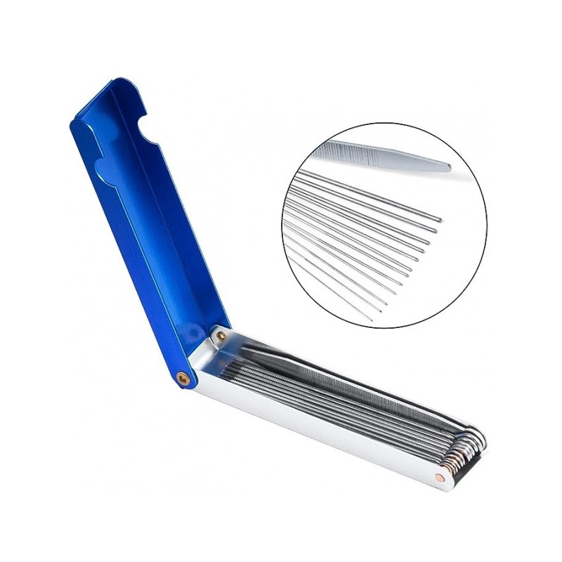För det första täcker satsen samtliga vanliga munstycksstorlekar som används vid handskärning. Med totalt 13 olika storlekar erbjuder den hög flexibilitet och gör det enkelt att hitta rätt nål för varje munstycke.