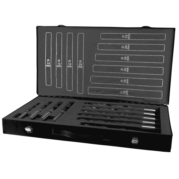 Komplett borrlåda som innehåller 10 stycken MK-borr i storlekarna 14-30 mm. Borrarna är av hög kvalitet och passar för professionell användning.