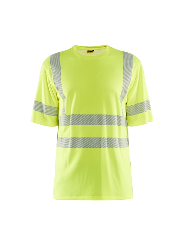 T-shirt i varsel med segmenterade reflexer för extra synbarhet. T-shirtens material har mycket god absorptionsförmåga, vilket gör att svetten transporteras ut från tröjans insida och får den att lägga sig på utsidan.