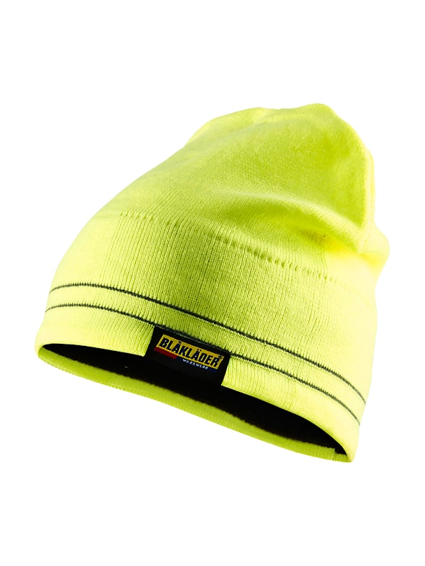 Mössa med fluorescerande färger och reflextråd instickad för ökad synbarhet. Stickad i mjuk akryl för komfort och värme.