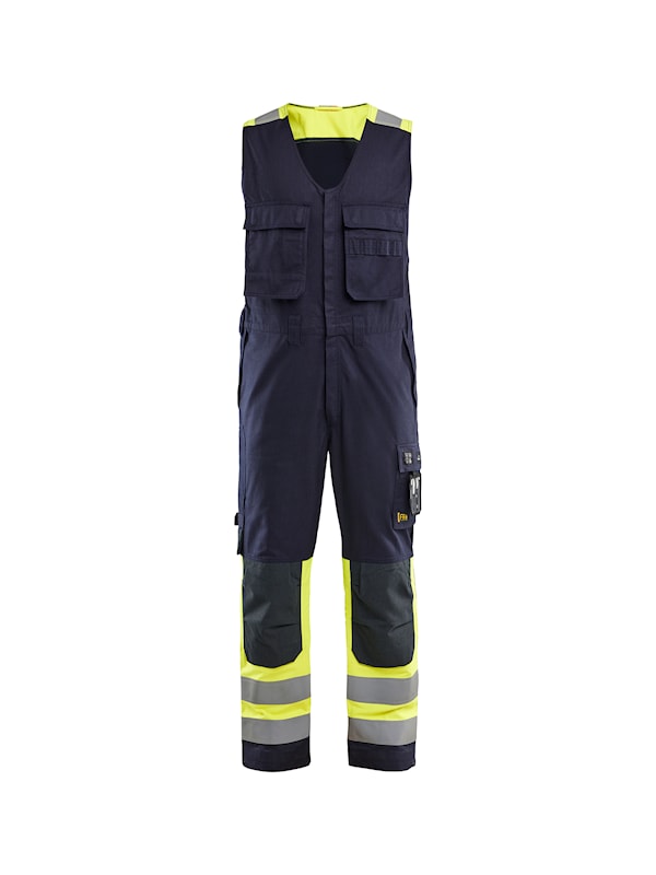 Bröstfickorna går att frigöras i nederkant vid framåtlutande arbetsställning. Förstärkta knäskyddsfickor med öppning underifrån.