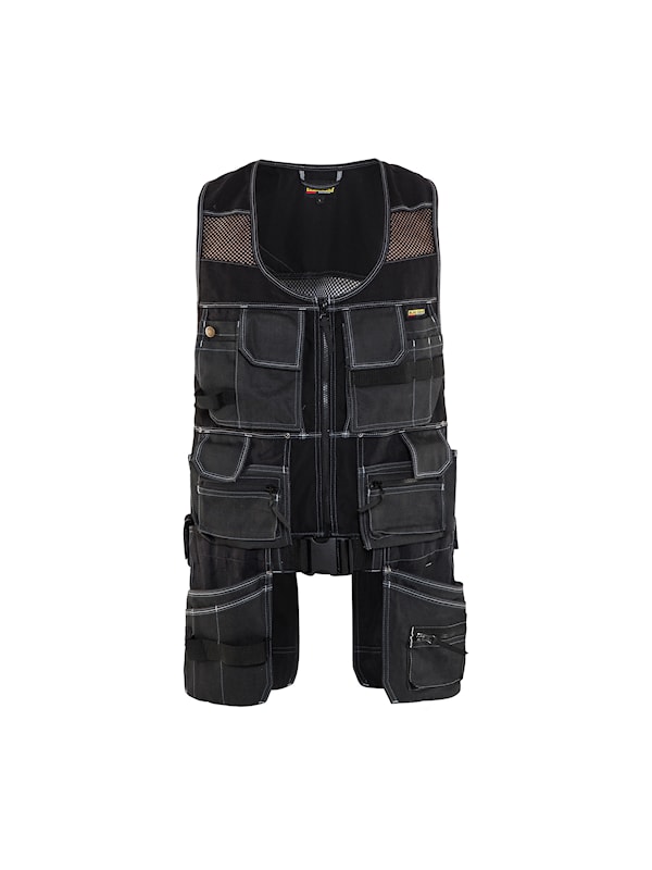 Modern hantverksväst med många praktiska fickor för verktyg och tillbehör. Avtagbara spikfickor och bälte för att avlasta axlar och nacke. Den har även dubbla dragkedjor fram för justering av vidd, vilket ger bättre passform och komfort.